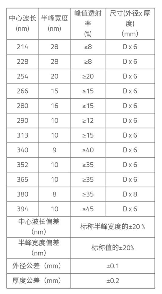 紫外帶通濾光片采用離子輔助沉積工藝(IAD)和等離子輔助沉積工藝(PIAD)制造,同樣具有長(zhǎng)久的使用壽命。以下是相關(guān)參數(shù)羅列: