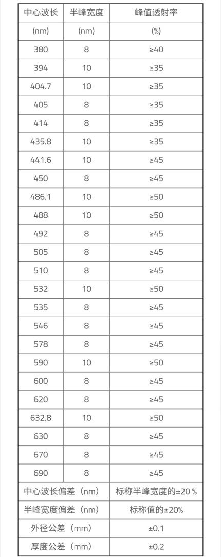 X-射線至近紅外區(qū)域的截止背景高于OD4、外徑尺寸從8mm至60mm,當(dāng)然如果您有需求在小于60mm或其他形狀帶通濾光片,