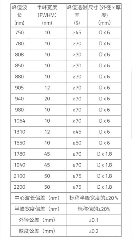 分為高性能窄帶、寬帶近紅外帶通濾光片,光譜覆蓋范圍700nm~3000nm。