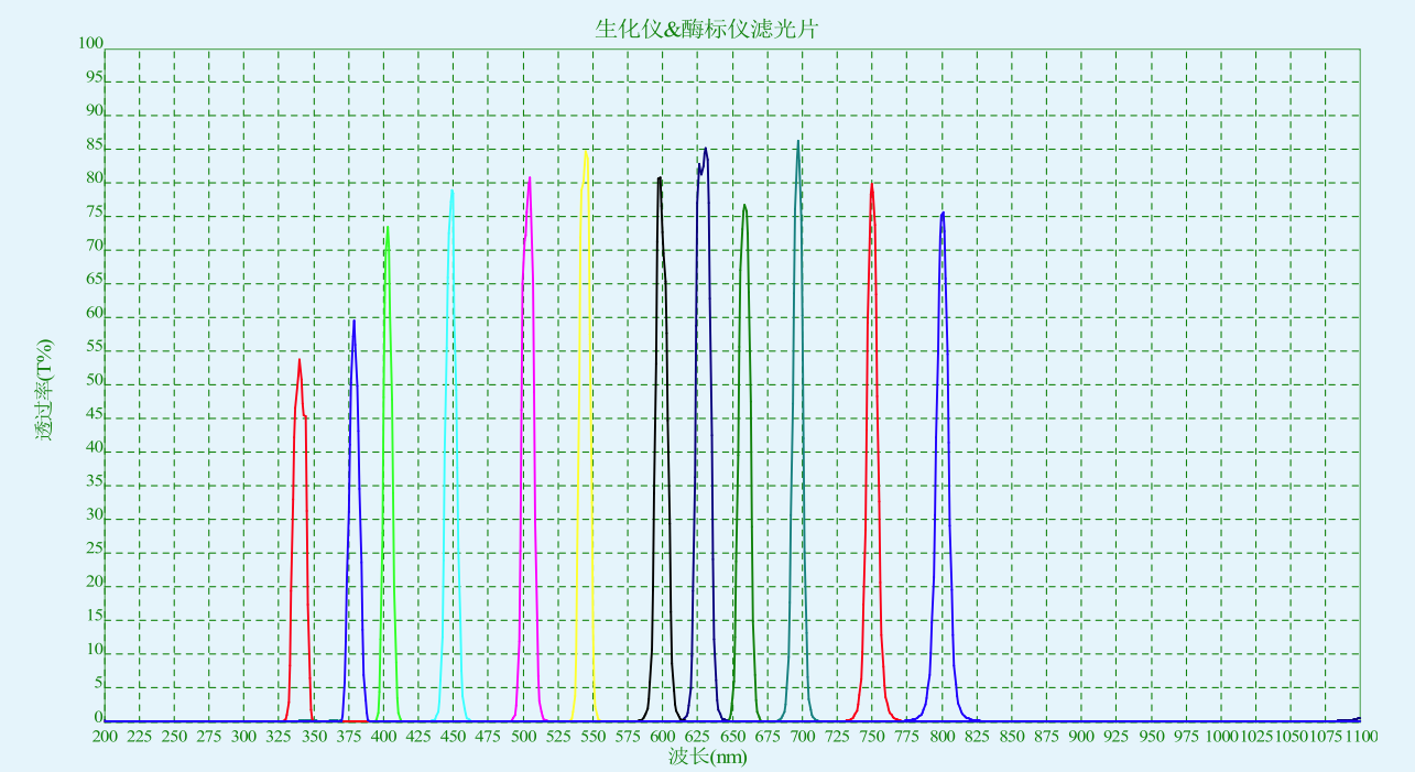 峰值透過率:340通道大于55%,380通道大于60%,405通道大于70%,剩余通道大于75%